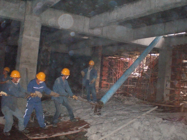 針對(duì)作業(yè)面在地下負(fù)二層,光線較差、通風(fēng)不暢,同時(shí)土建單位正在拆除臨時(shí)支撐,施工現(xiàn)場(chǎng)工作環(huán)境相當(dāng)惡劣等情況。為保證現(xiàn)場(chǎng)施工正常有序的進(jìn)行和施工人員身體健康,項(xiàng)目部采取相應(yīng)措施保證了整個(gè)現(xiàn)場(chǎng)的安全、照明、通風(fēng)。施工人員發(fā)揚(yáng)四化建吃苦耐勞、敢打敢拼的精神,長期冒雨作業(yè)。吊裝中有吊機(jī)運(yùn)行不到的地方,就積極開動(dòng)腦筋,用技巧、經(jīng)驗(yàn)和人力,保證前期設(shè)備及管道的吊裝倒運(yùn),為后期的施工做好了良好的鋪墊。