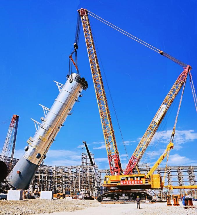 自今年9月20日以來, 苯乙烯項目部共成功吊裝第一脫氫換熱器、三聯換熱器、轉烷基化反應器、苯處理器、多乙苯塔、苯/甲苯塔等大型設備13臺,吊裝總噸位約達2000噸。其中,最重設備三聯換熱器重687噸,高41米,最大吊裝高度63米;而這次吊裝的低壓粗苯乙烯塔,塔體總高度92.2米,重量950噸,是整個大型設備吊裝中最復雜的設備之一,分兩段運至施工現場,由2000噸吊車吊起來空中組對、焊接。