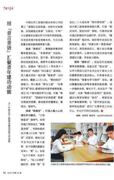 近日,由共青團中央主管主辦的工作指導刊物《中國共青團》2025年第20期專版刊載了中國化學工程四化建青年理論學習工作經(jīng)驗文章《用“青言青語”匯聚化建青年建功動能》,對公司用黨的創(chuàng)新理論賦能青年成長、用黨的初心使命引領青年建功的創(chuàng)新路徑進行專題報道,為央企青年思想政治引領工作蓬勃發(fā)展提供了可復制、可推廣的實踐樣本。