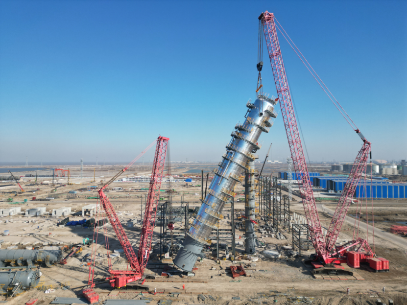 該項目位于河北滄州渤海新區(qū)港城區(qū)石化產(chǎn)業(yè)區(qū),自開工建設(shè)以來,項目部錨定“高標準、高質(zhì)量、高效率”履約目標推進工程建設(shè)。此次吊裝的分餾塔是項目核心關(guān)鍵設(shè)備,高61.6米、直徑6.4米,重274噸,具有吊裝難度大、技術(shù)要求高、安全風(fēng)險高的特點。